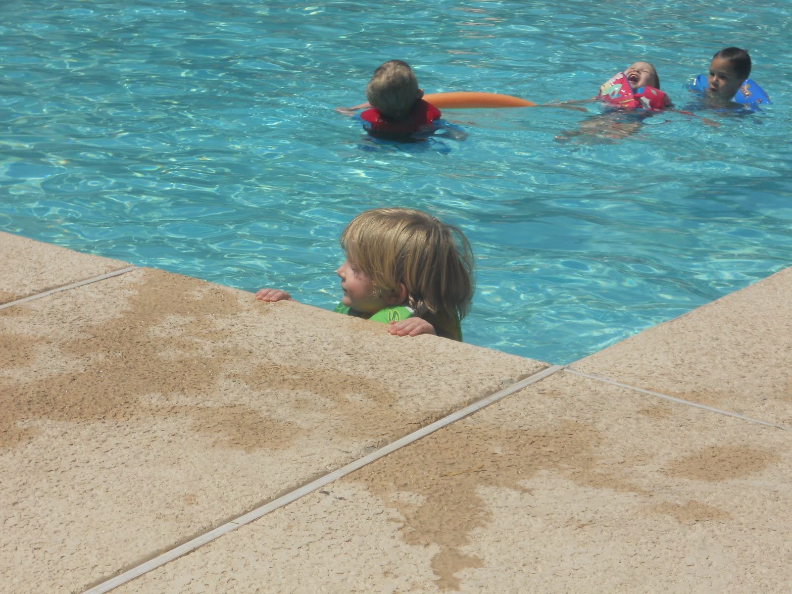During the summer we had a playgroup at a swimming pool. I had all of the boys' life jackets so that nothing too bad would happen. I knew Kade would get in and swim around, but I didn't think the other two would. Next thing I notice Kyle is in the pool hanging to the sides, but trying to swim. Right after that he was swimming in the middle of the pool having a great time. Now, as long as he has his life jacket on, he will go swimming all around the pool.