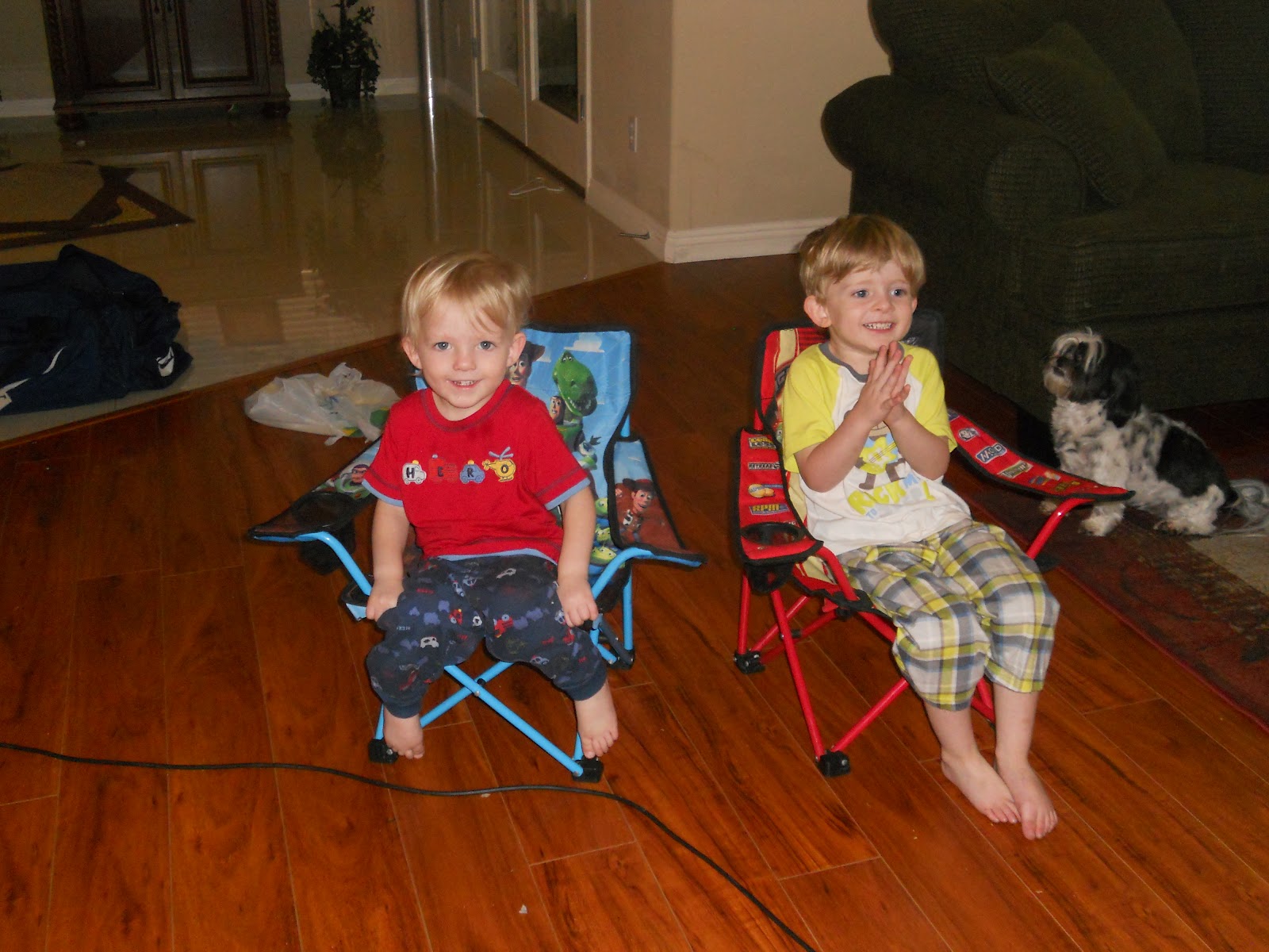 One day I had our soccer bag in the house. Kyle and Connor's fold up chairs are in it. They decided to pull them out. When I came downstairs I found Kade kicking the ball and they were sitting on their chairs clapping and saying "go Kade". It was so cute!!! They are probably two of Kade's biggest fans :)